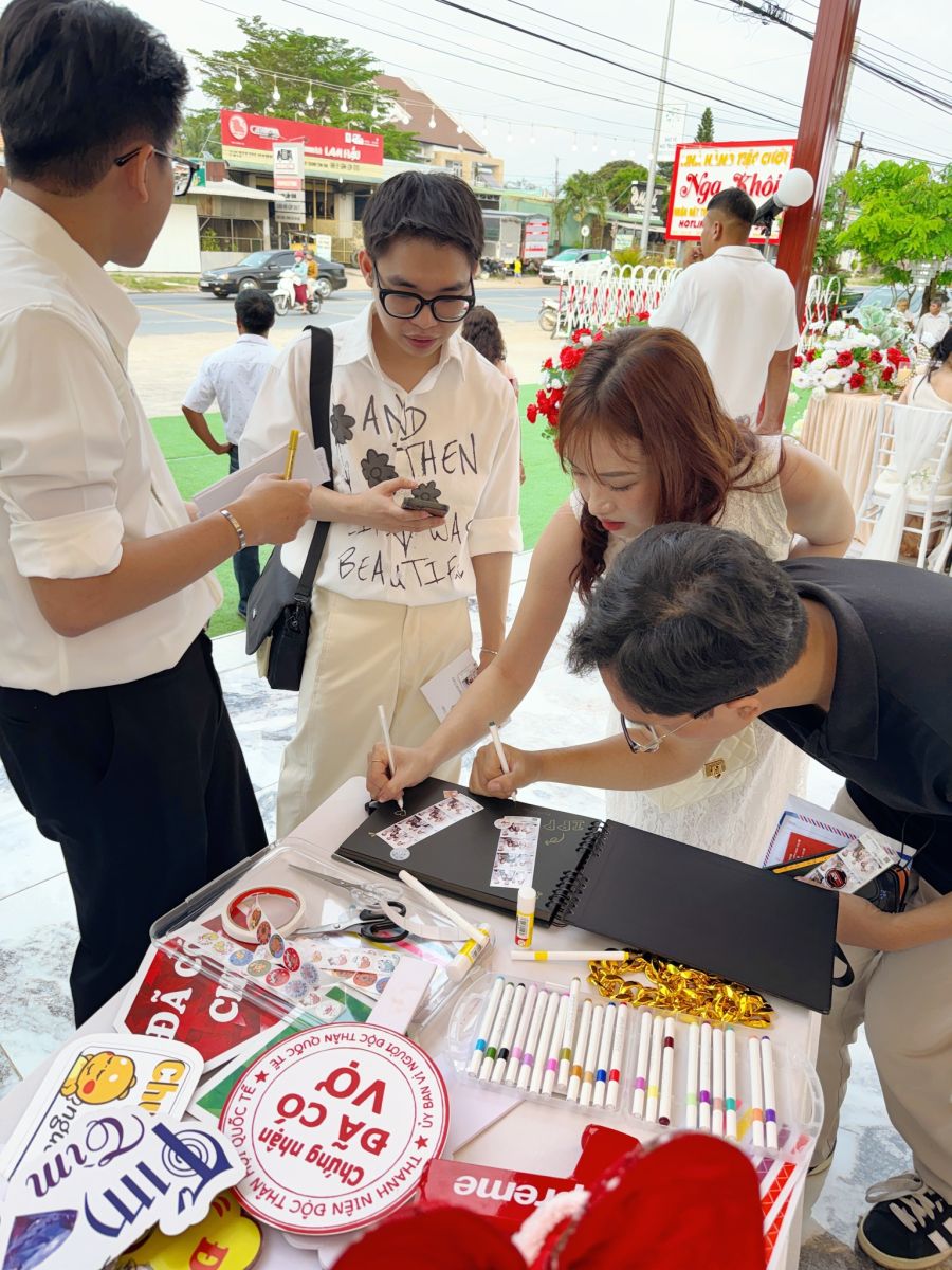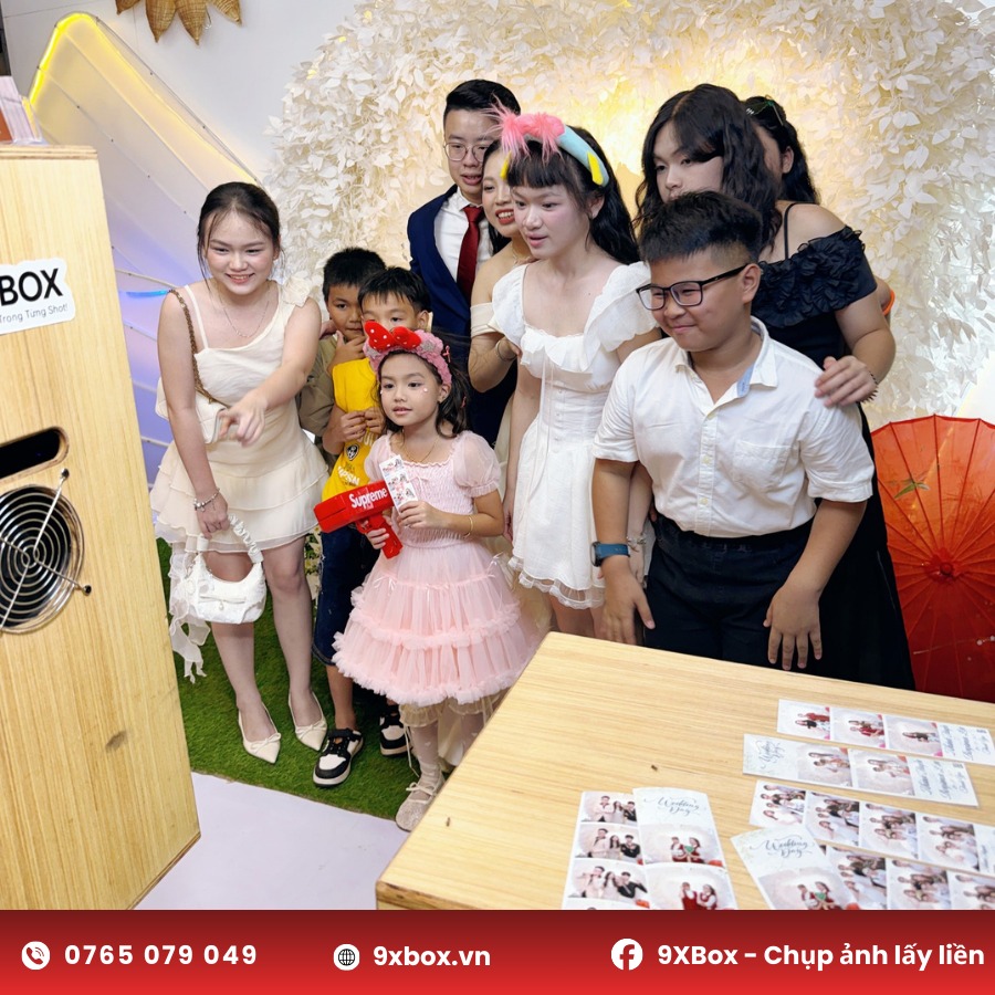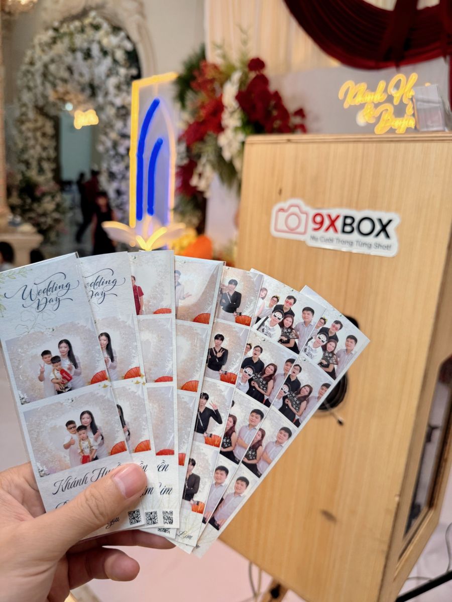 Buổi tiệc trở nên sôi động hơn khi khách mời thích thú tạo dáng cùng photobooth lấy liền 9XBox. Những tấm ảnh filmstrip đáng yêu, sắc nét, được in ngay tại chỗ đã giúp mọi người ghi dấu lại khoảnh khắc vui vẻ bên cô dâu – chú rể.