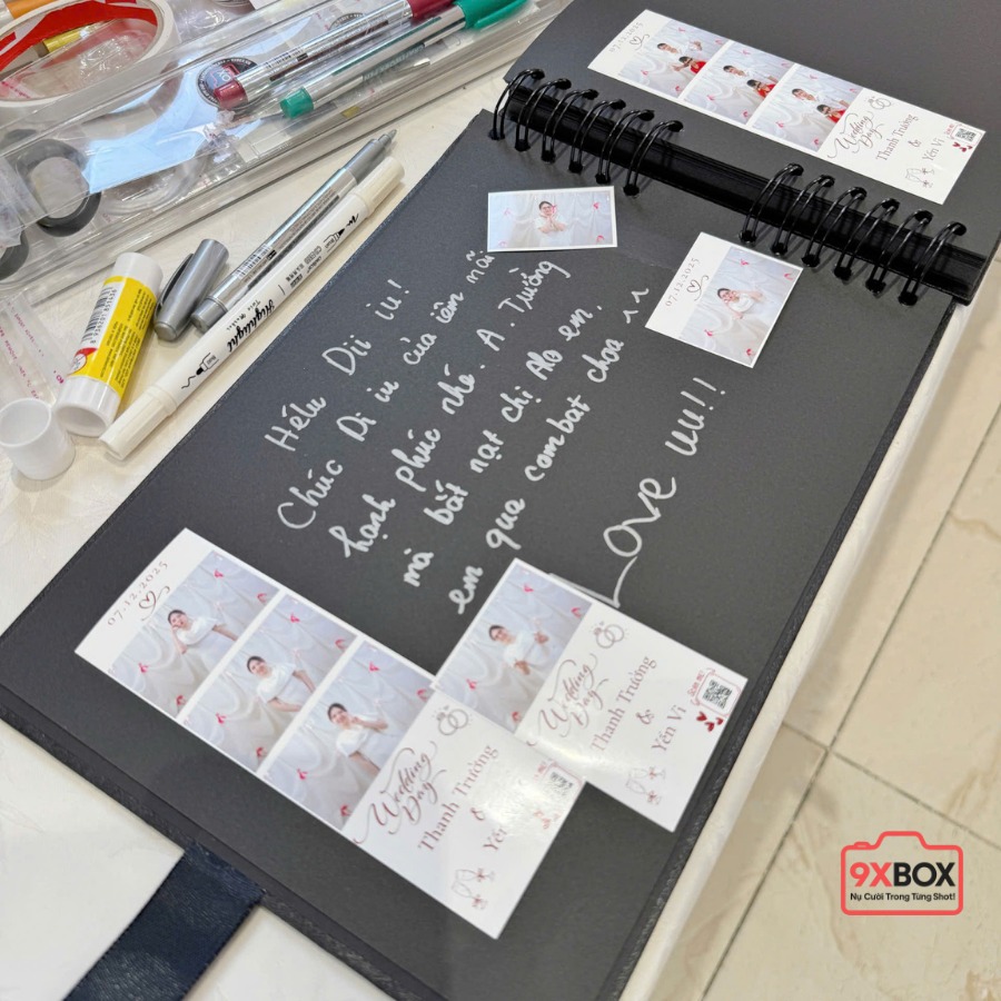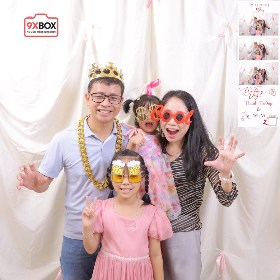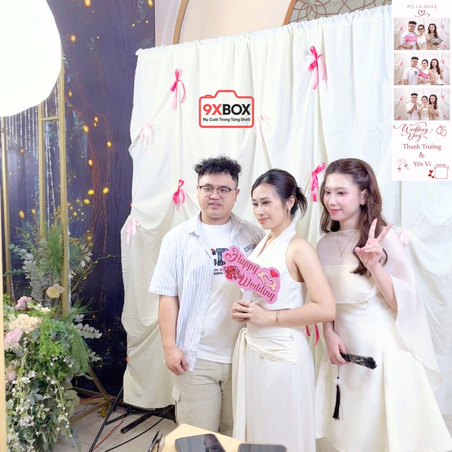 Một trong những điểm thu hút nhất của buổi tiệc chính là góc Photobooth 9xBOX – nơi bạn bè của cô dâu chú rể đã thoải mái tạo dáng, cười đùa và lưu lại những khung hình kỷ niệm. Không khí vui tươi lan toả qua từng nụ cười tự nhiên, ai cũng háo hức ghi lại dấu ấn trong ngày trọng đại của đôi bạn.